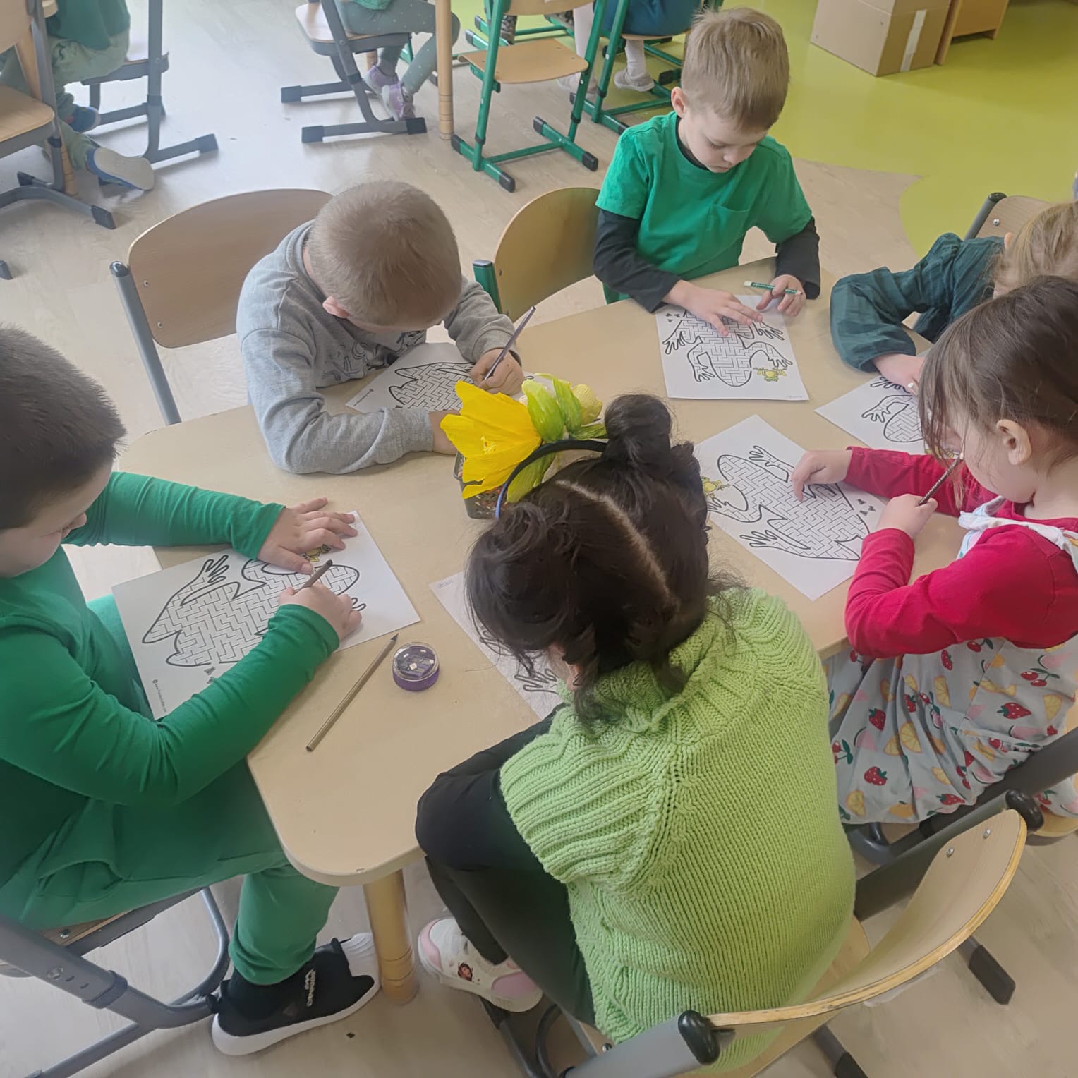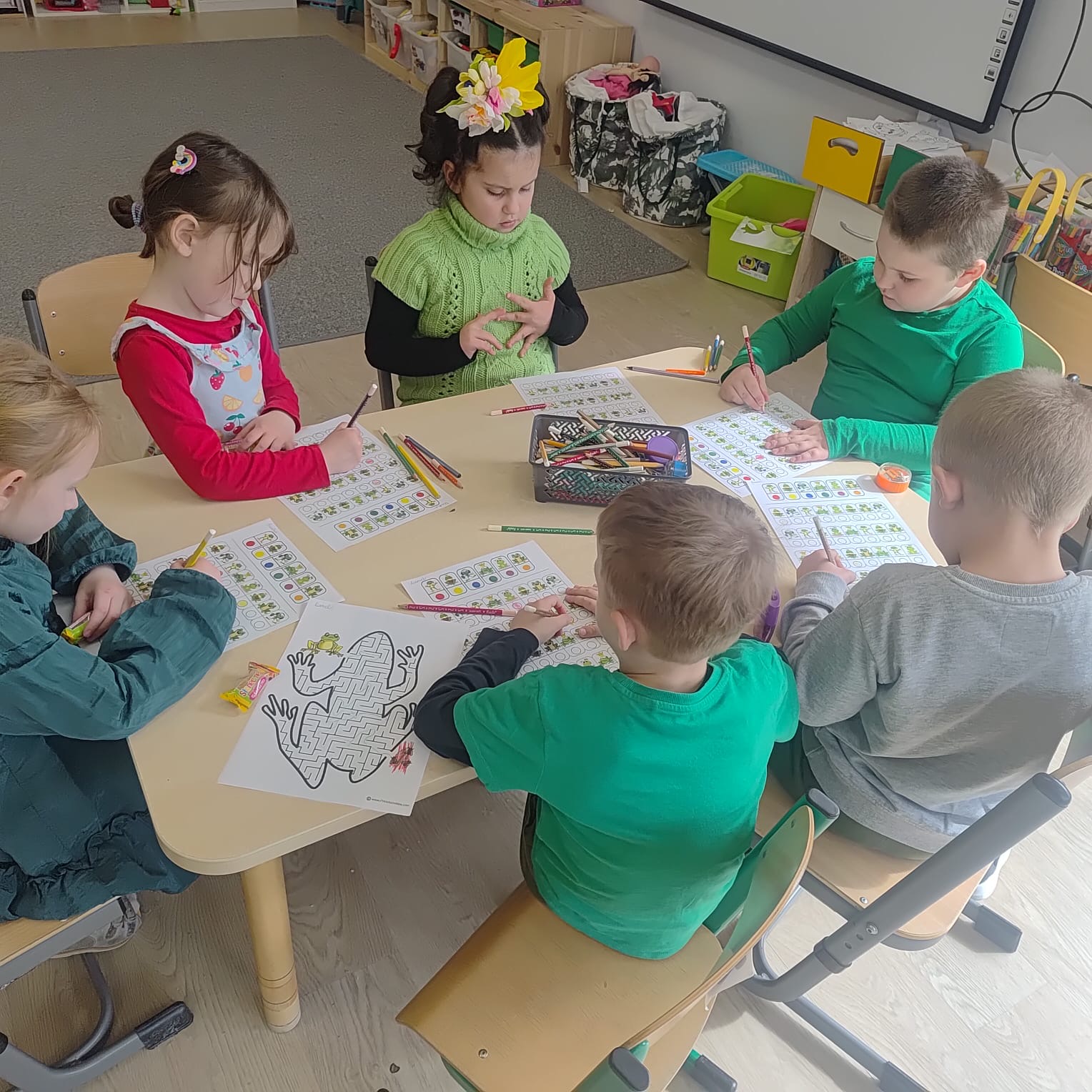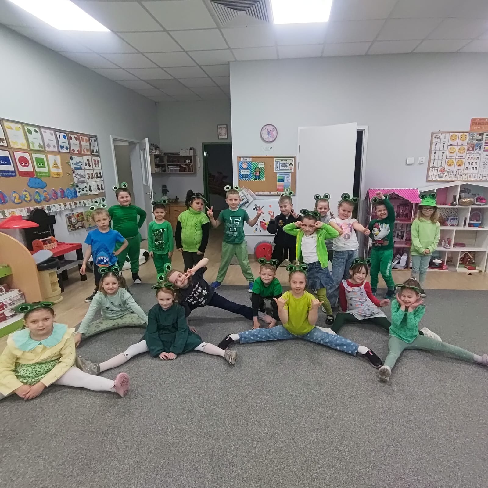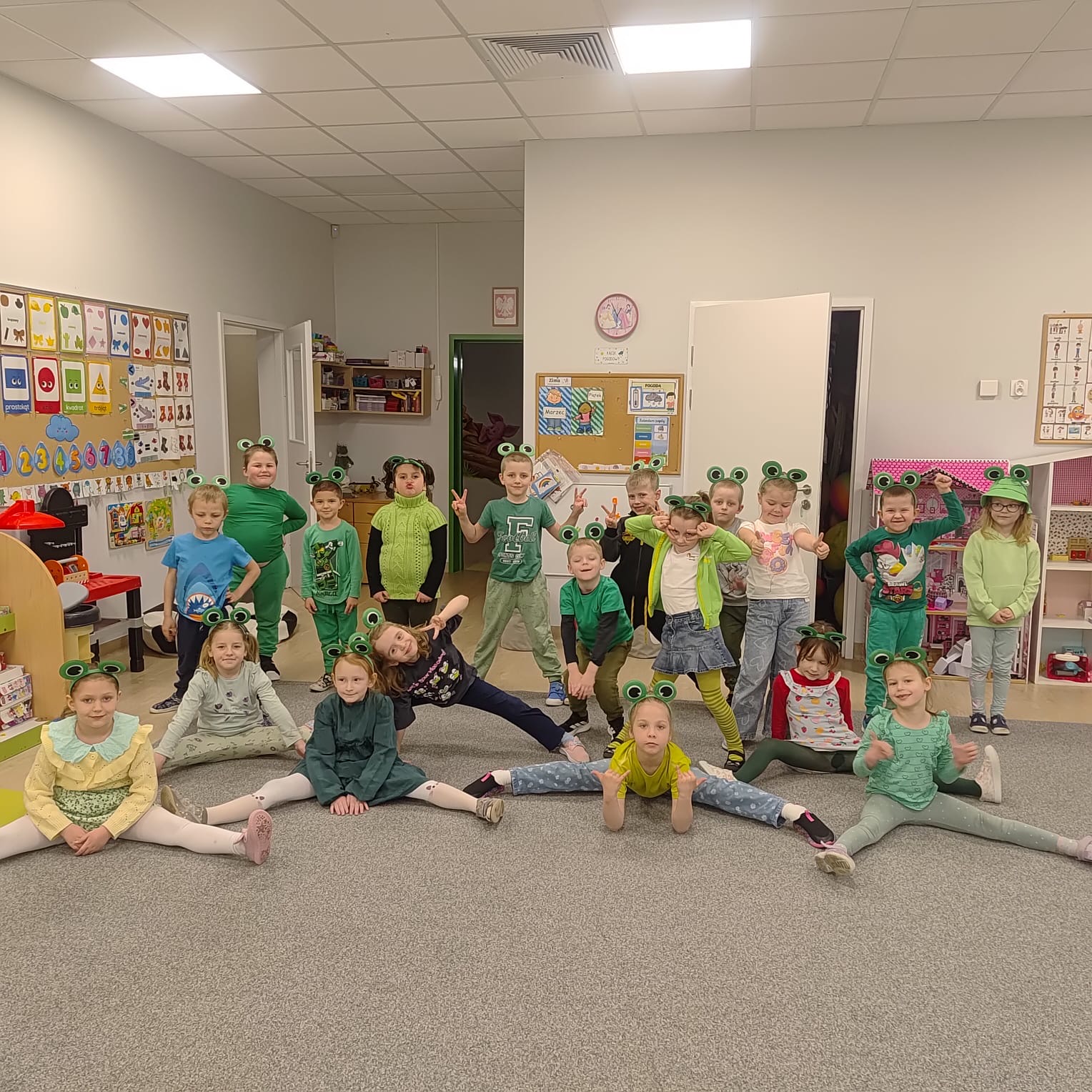 20 marca grupa „Żabki” obchodziła wyjątkowe święto – Dzień Żaby. Był to dzień pełen radości, ciekawych aktywności i zabaw, w całości poświęcony tematyce żab. Dzieci miały okazję poznać cykl rozwoju żaby, dzięki czemu dowiedziały się, jak z małego skrzeku powstaje dorosła żaba. Z dużym zainteresowaniem wysłuchały także opowiadania o przygodach i problemach zielonej żabki, a następnie aktywnie uczestniczyły w rozmowie na temat jego treści, dzieląc się swoimi spostrzeżeniami i przemyśleniami. W trakcie zajęć przedszkolaki wykonały piękne prace plastyczne, rozwijając swoją kreatywność i zdolności manualne. Nie zabrakło również różnorodnych kart pracy – dzieci rozwiązywały zadania z zakodowanymi żabkami, pokonywały labirynty oraz ćwiczyły grafomotorykę. Podczas całego dnia dzieci poznały wiele ciekawostek na temat życia żab, a zdobyta wiedza była utrwalana poprzez zabawy i aktywności tematyczne. Dzień Żaby upłynął w radosnej atmosferze i dostarczył wszystkim wielu pozytywnych wrażeń.